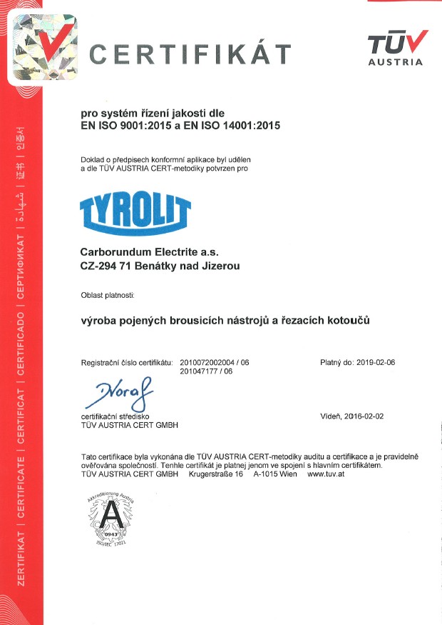 - Prohlášení Rakouské cerifikační společnosti TÜV o splnění ISO norem ve firmě Carborundum Ellectrite